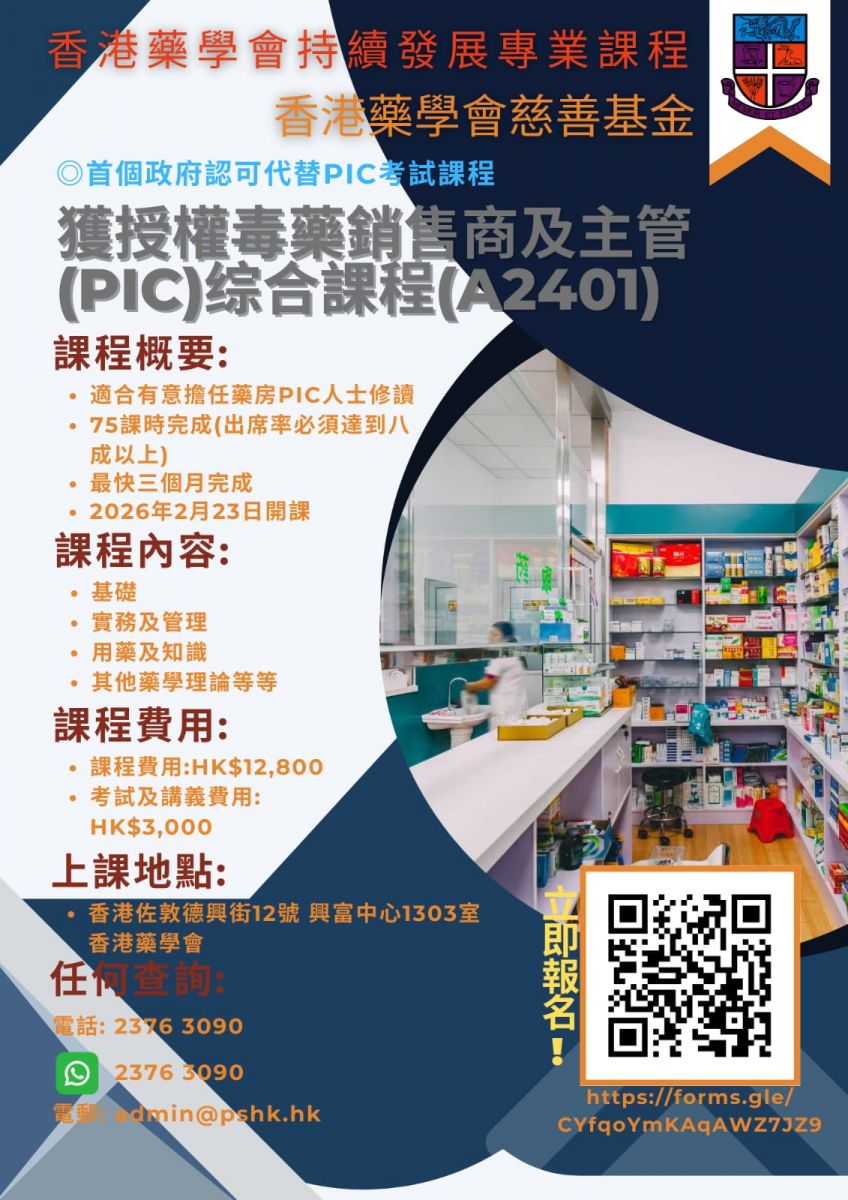 ***課程由香港藥學會慈善基金 (下稱"基金")主辦***